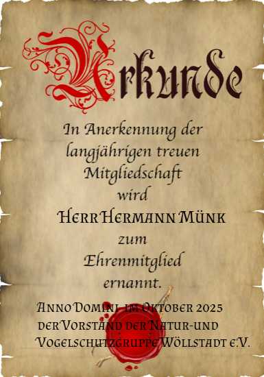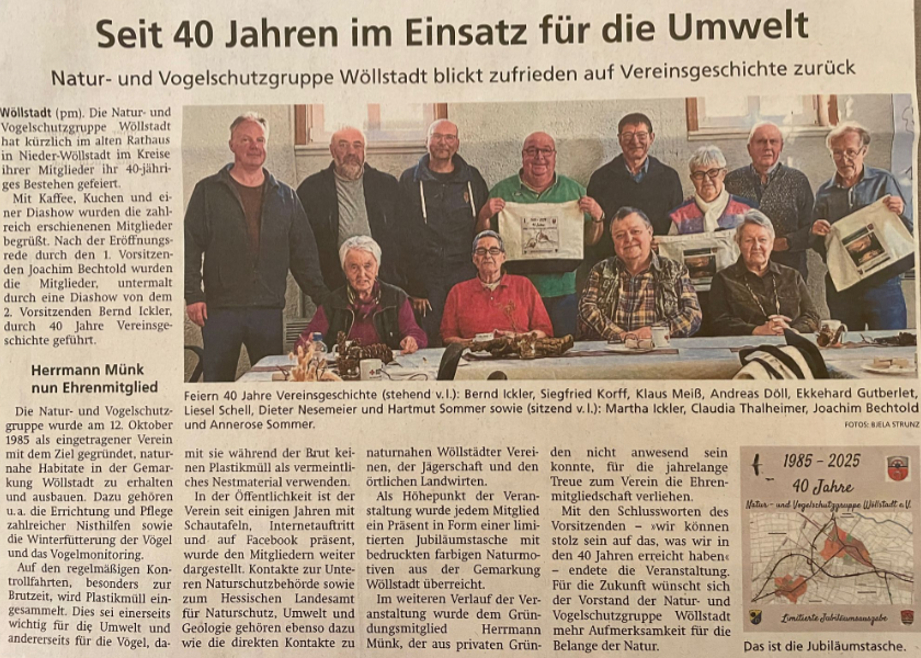 Am 18.Oktober 2025 feierte die Natur-und Vogelschutzgruppe Wöllstadt e.V. im alten Rathaus in Nieder-Wöllstadt im Kreise Ihrer Mitglieder Ihr 40-jähriges Bestehen.